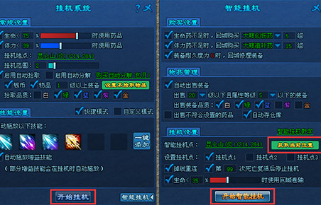 快捷Ctrl+Z或者点击屏幕右上方的【挂】按钮,就可以进入挂机设置界面了。设置好智能挂机条件,选择挂机地点后,点击【开始智能挂机】按钮即可。