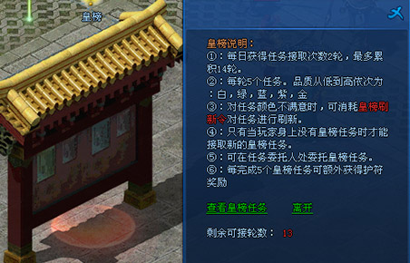 皇榜任务每天两轮,可以累积14轮,不必担心今天来不及做而丢失任务,实在不想做,可以在任务委托人处委托皇榜,花一些费用,即可完成。皇榜任务等级按颜色分为金、紫、绿、蓝、白,可以使用皇榜刷新令或者钱币刷新任务。