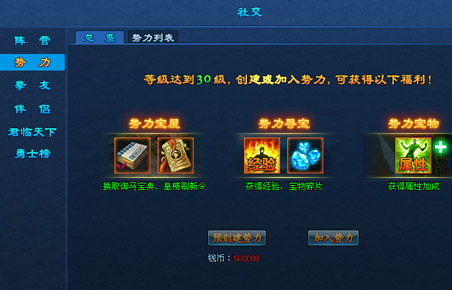 大侠加入势力后,可以通过势力贡献兑换相应宝物,参加势力活动可以获得大量的经验及贡献,势力宝物还能使角色获得属性加成,势力首领还可带领本势力成员参与争王战和皇城争夺战,实现称霸天下的梦想。