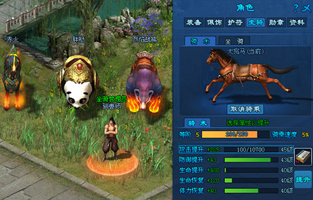 大侠可以通过道具【御马宝典】逐步提升坐骑等级,从而提升坐骑的速度,也可以通过收集道具【坐骑之灵】在主城驯兽师处兑换特殊坐骑,还可通过活动获取极品坐骑。