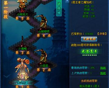 大侠可以通过王者试炼获得技能的提升,并得到一定经验奖励,每通过一个章节,将获得不同道具奖励。