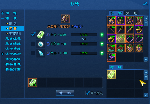 注:若要单个放入,请在界面中先勾选单个放入,在点击材料既可。