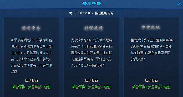 1、每天8:00-22:00,随机刷新物资争夺、刺探敌情、冲突之地;