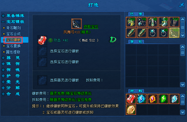 4、每次宝石镶嵌随宝石等级的不同收取一定的钱币,拆卸免费;