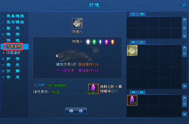 2、左键点击包裹内的饰魂,将其放置到锤炼栏中;