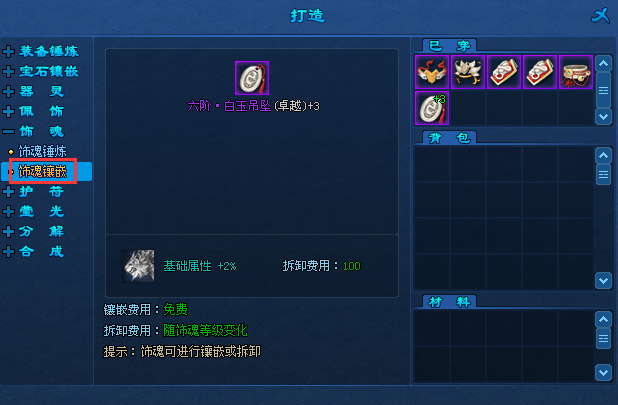 3、左键点击材料框内的饰魂,即镶嵌成功,若点击已经镶嵌在佩饰上的饰魂,则为拆卸;