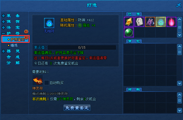 2、免费机会使用完后,可使用“神灵符”对护符进行再鉴定;
