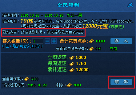 例:购买一份后,当即可返还5000元宝,剩余的分4次返还,返还的元宝需要点击上图“领取”按钮才能到角色。