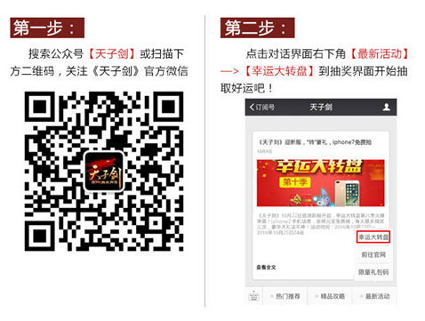 活动方式:关注《天子剑》官方微信,点击对话框右下角【最新活动】—【幸运大转盘】,即可每天免费抽奖一次,每天分享活动到朋友圈,每天可额外再获得两次免费抽奖机会(分享给朋友只能获得一次哦),各位大侠们可要好好把握,最爽莫过于三连抽呢。