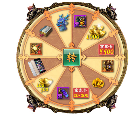 2、点击金豆可开启幸运转盘,有机会获得iphone7,京东卡,极品坐骑,元宝等奖励;元宝通过游戏内邮件发放,京东卡将以卡密形式发放;