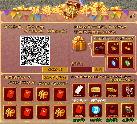 超值游戏礼包2元抢购活动开启啦!邀请好友抢礼包,更能开启重磅盲盒奖励, iPhone12,京东卡购物卡、微信红包、手机话费等海量好礼等你来领取!小伙伴们快来参加吧!