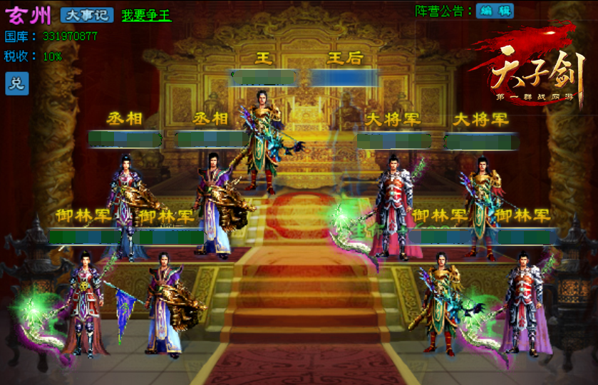每周五晚8:00—8:30,《天子剑》都会爆发一场紧张激烈的争王战,各阵营的势力首领带领兄弟进入宫廷战场,抢夺天坛。这是一场强者的对决,唯有实力最强的势力,才能品尝胜利的果实!——夺得王位的势力首领将登上本阵营王座,可以分封诸侯大臣,御林军,伴侣也将晋级为王后,真可谓一荣俱荣。不仅如此,势力首领还可以管理本阵营的事务,获得大量元宝奖励和主城部分税收,更能决定阵营的立场,带领本阵营战士前往参与夺鼎战和皇城争夺战,获得更多奖励!
