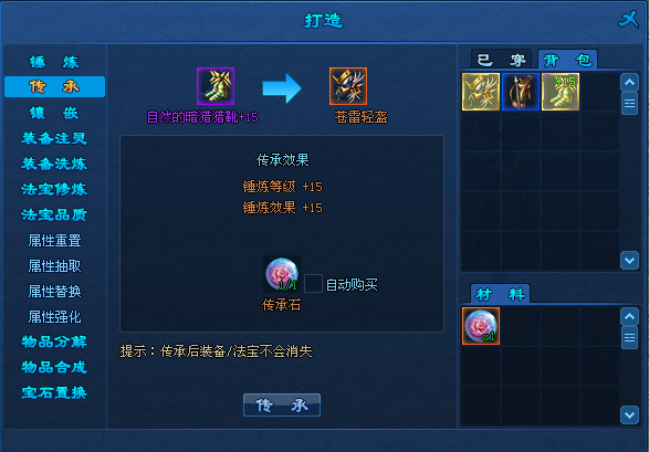 许多人在锤炼装备时,都担心强化完了之后,到装备更新换代时,只能将该装备弃之仓库或者低价转卖。那样,费尽心血的努力,全部付之东流。而《天子剑》全新登场的传承系统,让旧装备依旧被需要,变废为宝。只需要一颗小小的传承石,就能将装备的锤炼效果转移到另外的装备上!