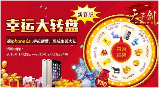过年最快乐的时光莫过于手里拿着红包,嘴里吃着山珍海味了!在《天子剑》新服,豪礼依旧送,干架有福利。活动期间,皇城将出现大量金鹿,玩家击杀金鹿,可获得道具金豆一枚或数量不等的流通钱币;点击金豆可开启幸运转盘,有机会获得iphone6s,京东卡,极品坐骑,元宝等奖励!