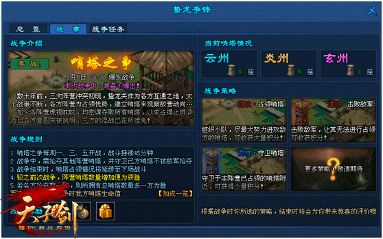 蛰龙关作为各阵营互通之地,是《天子剑》最大的PK战场之一。为资源为利益,此处的大小战事从不间断,而“哨塔之争”则是矛盾和冲突的具体表现!战前,通过一桩桩一件件的战争任务来提高本方阵营哨塔的军资等级。待哨塔之争正式爆发,那争夺的场面更是惨烈...