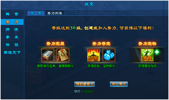 在《天子剑》中,只要等级达到30级的大侠都可以消耗50W钱币进行势力预创建。势力预创建后,组团击杀“巡山小将”方可激活势力,开启各种势力玩法、功能。届时呼朋唤友齐聚一起完成各项势力活动,从而让势力发展得更繁荣!
