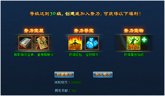 新建势力无需激活,只需玩家角色等级达到30级,拥有300贡献,并消耗50W钱币,您就能成为势力的创始者,引领风骚,共绘宏图。