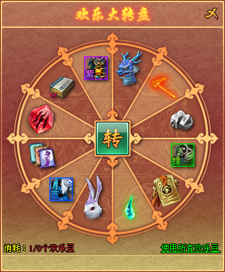 3活动内容: 1、玩家可使用活动道具"欢乐豆"来进行转盘; 2、拼运气,看人品,转盘后,可获得稀有坐骑等丰厚的道具奖励; 3、欢乐豆获取途径: 3.1 通过击杀"天狗"(12:30和18:30出现在皇城)、参与护花使者活动获得; 3.2 组队击杀"天狗"时,一定范围内的队友都能获得一个欢乐豆; 3.3 少于世界等级15级的角色无法获得欢乐豆。